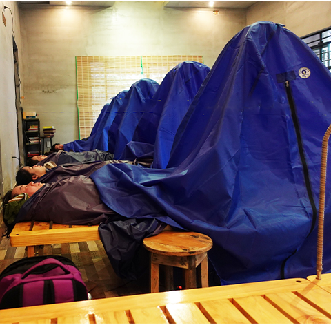 lo nghĩ, phản ứng, phòng vệ. Khi cơ thể đủ ấm, hệ thần kinh phó giao cảm được kích hoạt. Đây là hệ thần kinh của nghỉ ngơi, hồi phục và chữa lành. Nhiệt ấm nói với não rằng: “Không có nguy hiểm. Bạn có thể buông xuống.” Vì vậy, sau khi xông hơi, nhiều người không cần cố ngủ. Họ chỉ… chìm vào giấc ngủ. Thiền xông hơi không chữa mất ngủ. Nó chỉ tạo điều kiện để cơ thể nhớ lại cách ngủ. Ngủ sâu là bản năng. Chỉ là lâu rồi ta quên mất.